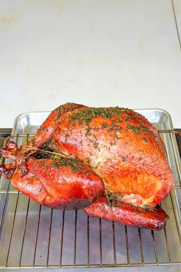 If you want smoked turkey with crispy skin make sure you don’t tent the turkey with foil or wet brine. Dry brining your turkey is the best method for crisp skin.