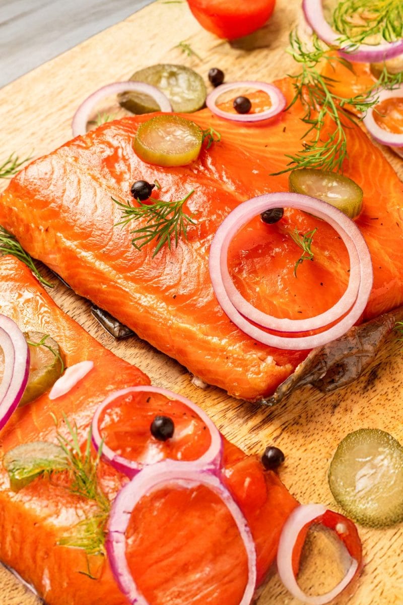 - Remove trout from the smoker. Top with dill, pickles and sliced red onion. Serve on grilled bread with sour cream on the side.