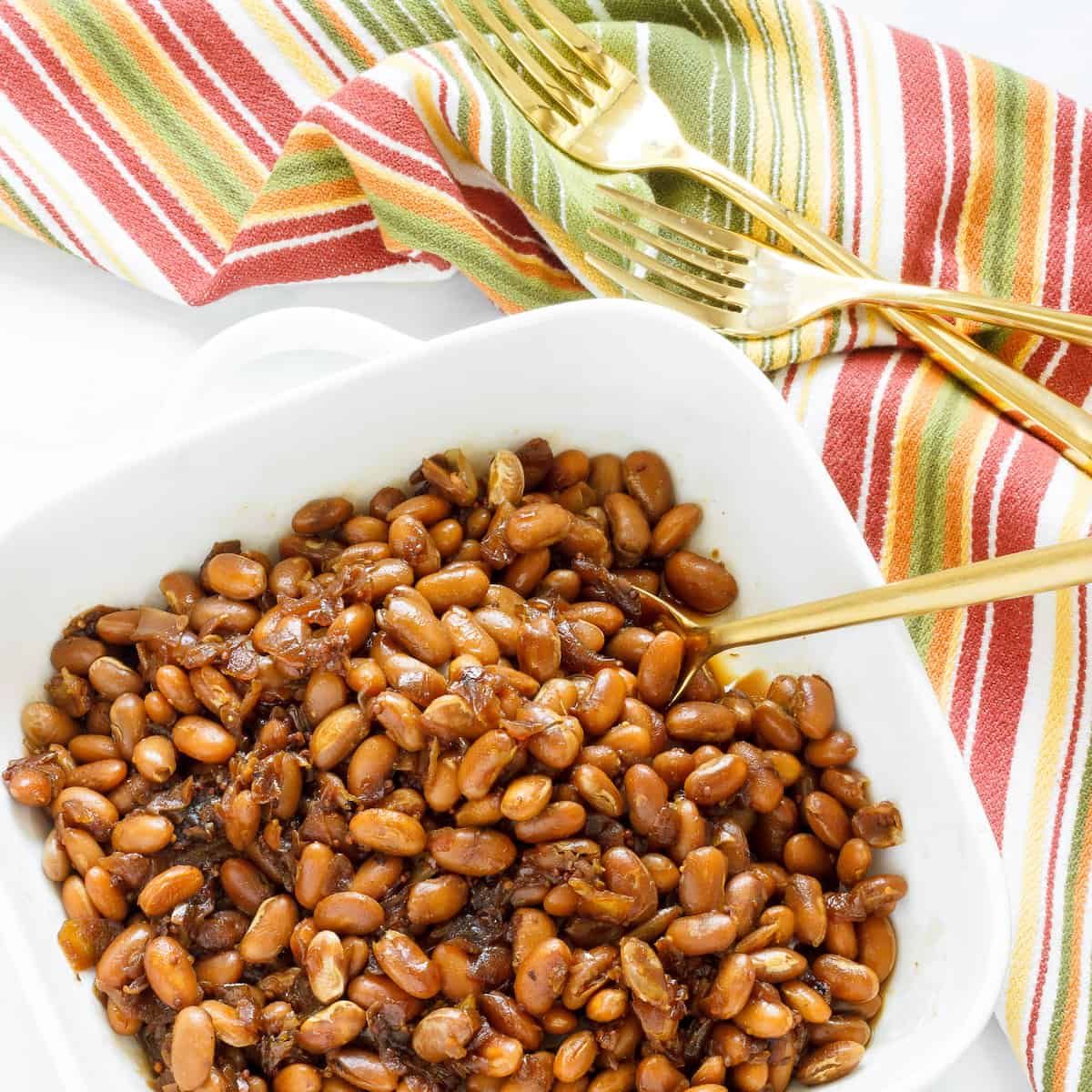 These sweet and savory crockpot baked beans are made from scratch with canned white beans, molasses, and mustard. They’re perfect with ham.