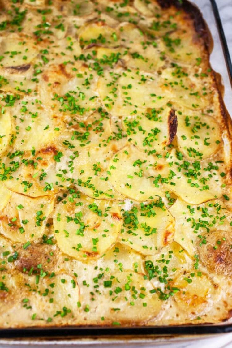 These au gratin potatoes with gruyere cheese are easy to make because you don’t have to make a cheese sauce! Thinly slice the potatoes, toss with cheese, and pour half and half over the top.