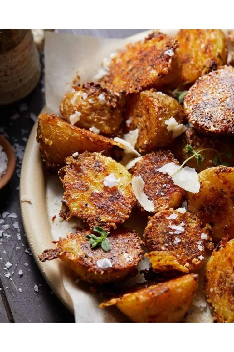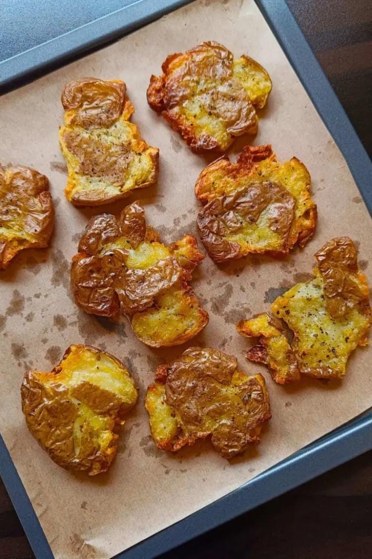 Small potatoes are boiled, then gently smashed and drizzled with garlic oil before being air-fried until crispy. They are perfect as a side dish for ham or an appetizer.