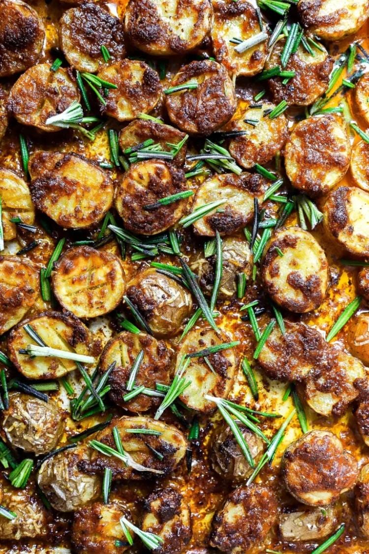 These crispy Oven-Roasted Yukon Gold Potatoes only require seven ingredients and are the perfect easy side dish. Roasting at a high temperature (425 degrees) helps them develop lots of color and get nice and crispy.