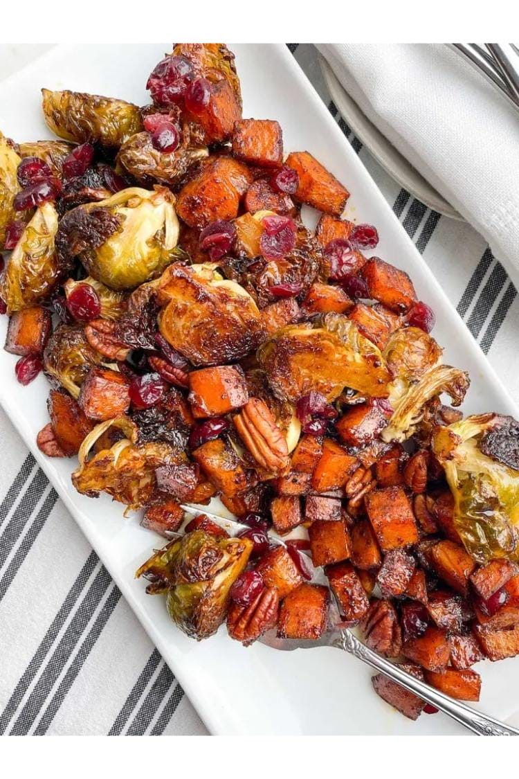Roasted Brussels Sprouts and Sweet Potatoes with toasted pecans and plump cranberries are tossed in maple balsamic vinaigrette for the perfect sweet, savory side dish for ham.