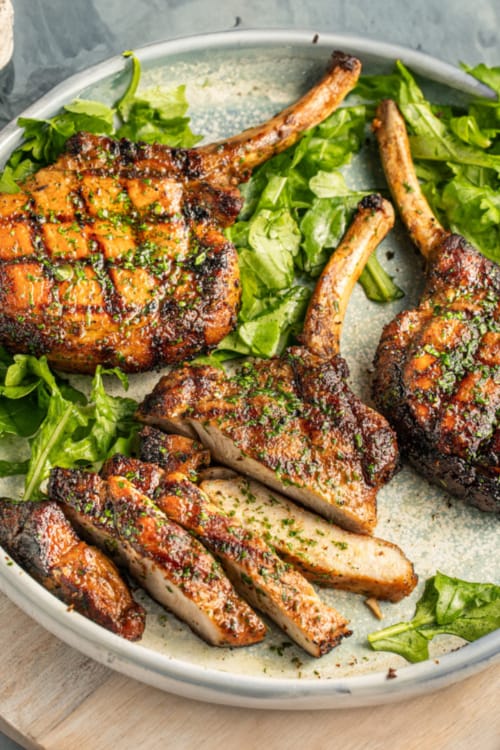 When you flip or rotate the pork chops, you rotate the meat 180 degrees before placing it back down. The 180-degree rotation creates those perfect grill marks we all love. Grill the pork chop until the internal temperature is 145°F.