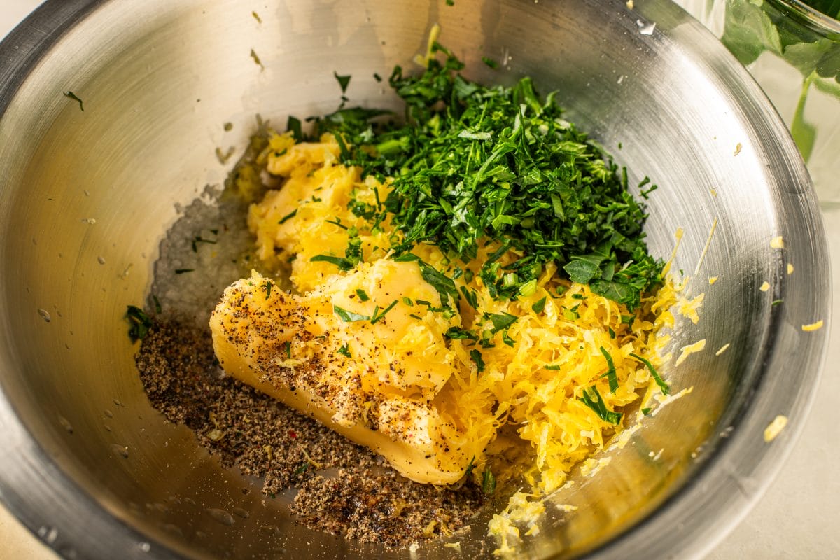 In a small mixing bowl, combine your softened butter with the minced garlic, finely chopped parsley, lemon juice, lemon zest, and salt.