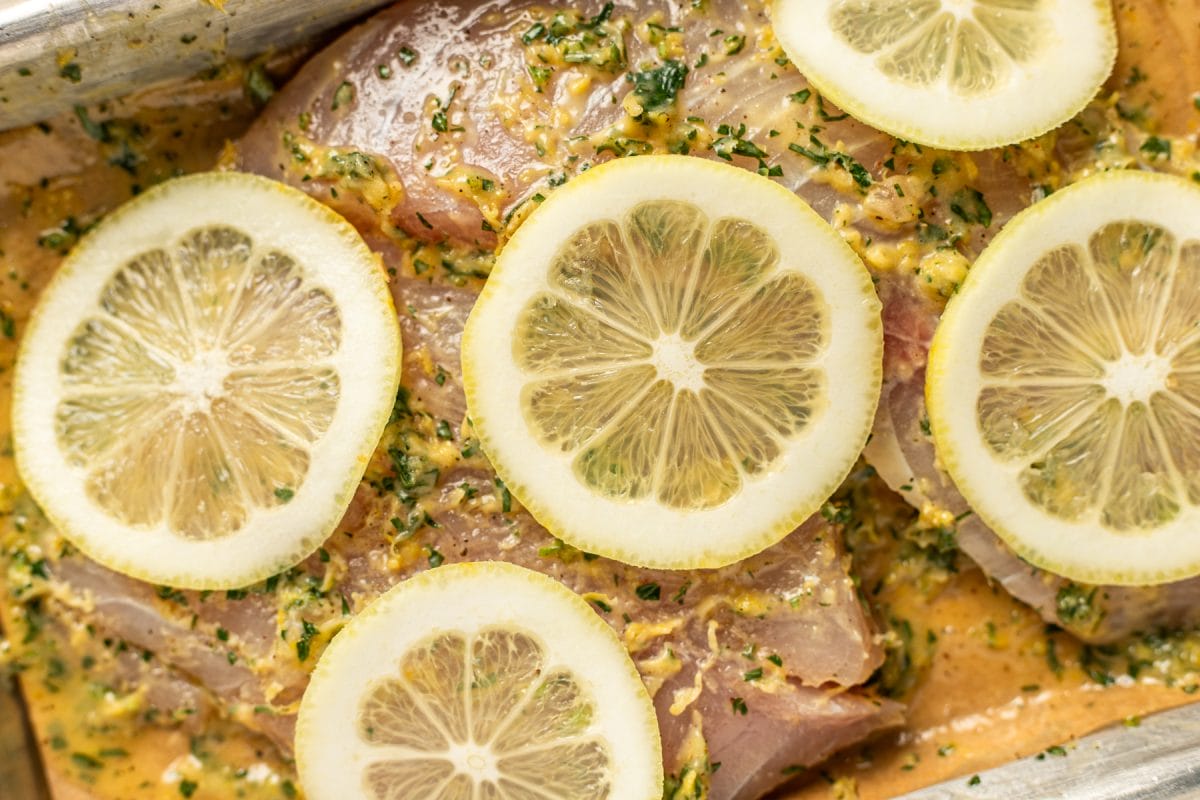 Divide your garlic, lemon, parsley, and butter evenly among the four fish fillets, placing a generous dollop on top of each piece. Add slices of lemon on top of the fish.