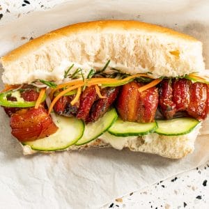Store leftover glazed pork belly chunks separately from the bread and toppings for best results. Let the pork cool to room temperature, then transfer to an airtight container and refrigerate for up to four days. The pickled vegetables will keep in their brine for up to two weeks. Store the baguette at room temperature in a paper bag for one day, or freeze for longer storage.