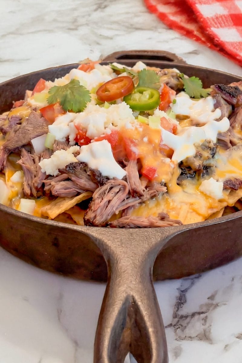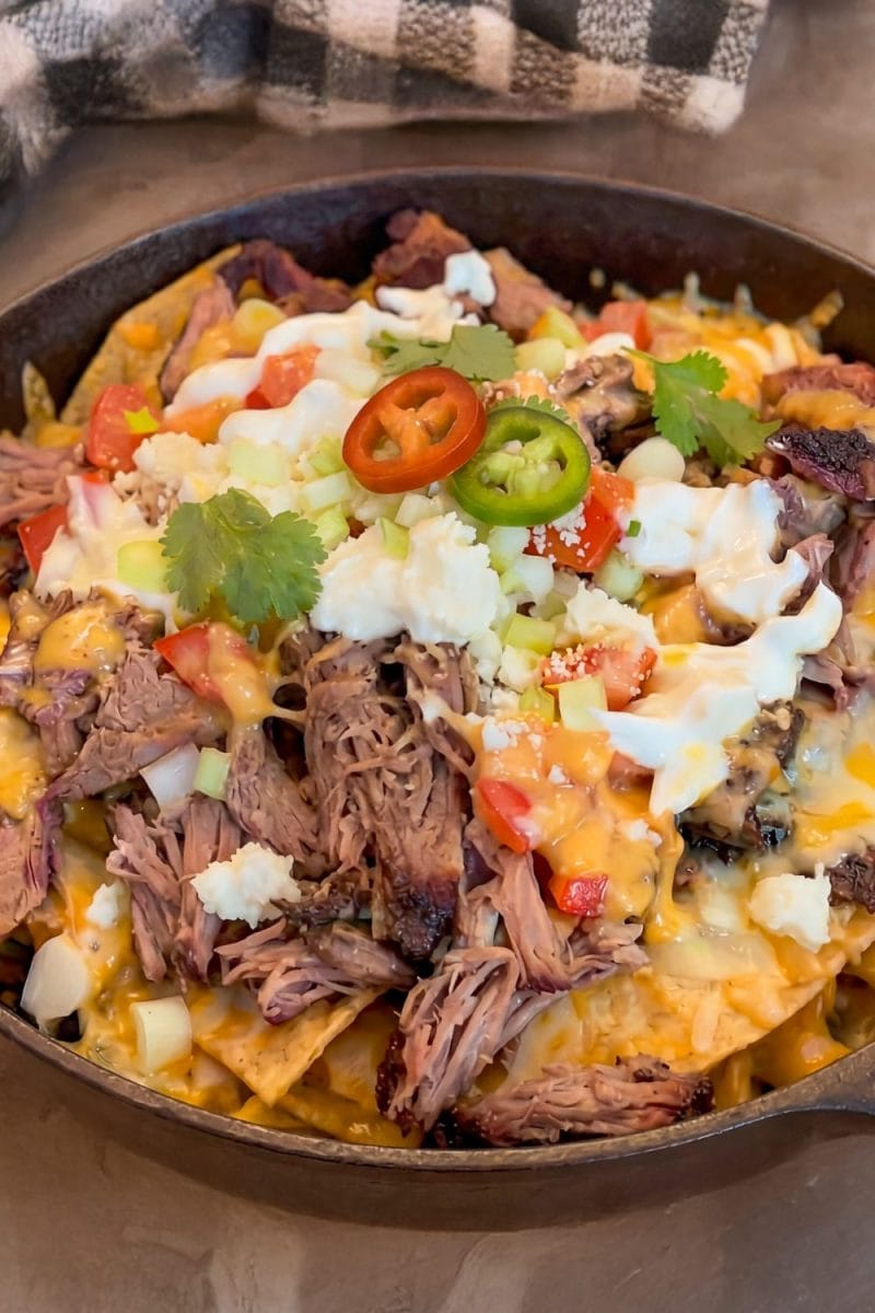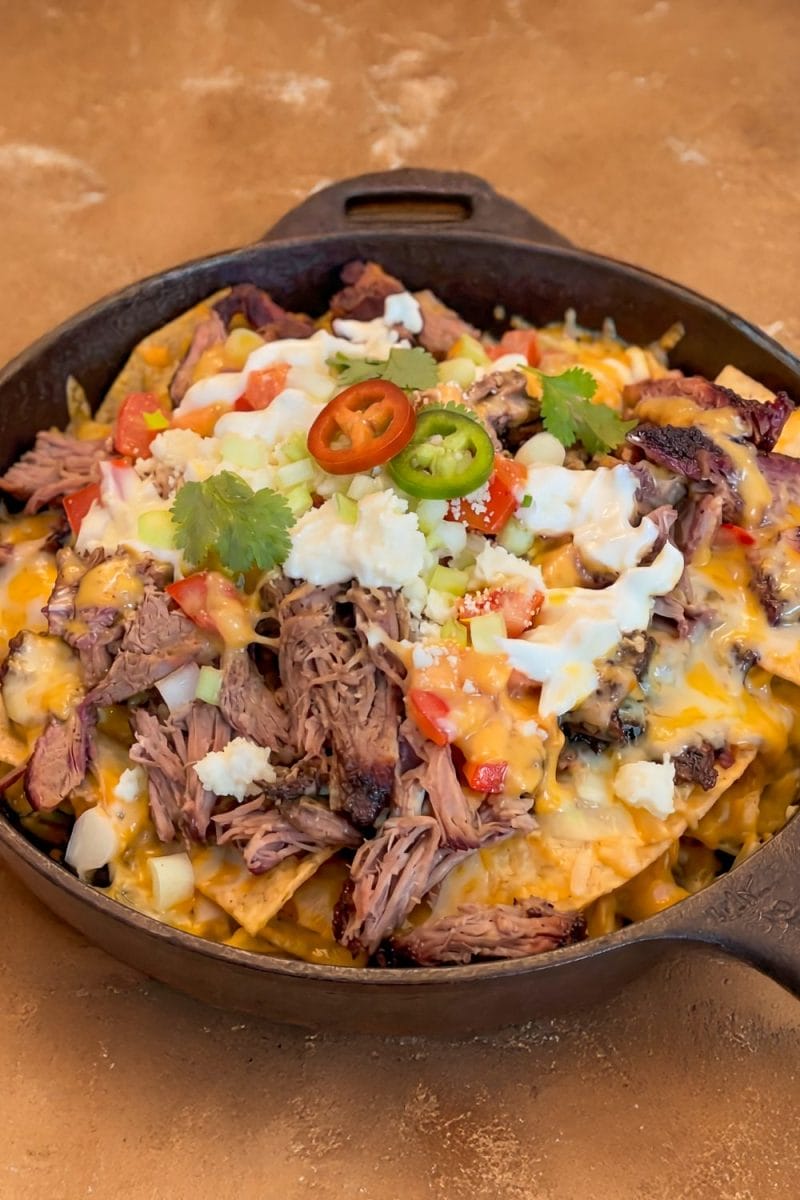 Leftover smoked brisket: The star of the show. You want brisket that has been smoked low and slow, so it is tender enough to chop into irregular bite-sized pieces that nestle between chips and catch all that melted cheese. If yours has been in the fridge, it will reheat beautifully in a covered skillet with a splash of beef broth — never microwave it or you will lose all the moisture. Check out my Texas Style Smoked Brisket for a full guide if you are starting from scratch.