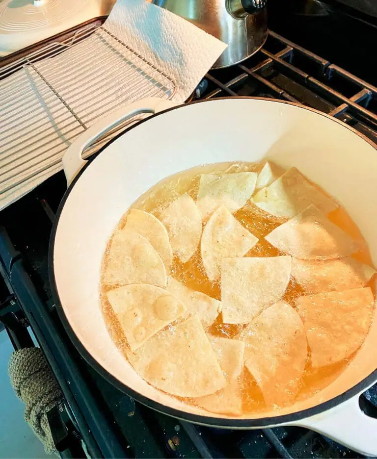 You can absolutely use store-bought chips here and there is no shame in that. But if you want that next-level freshness, cut corn tortilla shells into quarters and fry them in small batches in neutral oil at around 350°F until they turn lightly golden and stop bubbling, about 2–3 minutes per batch.