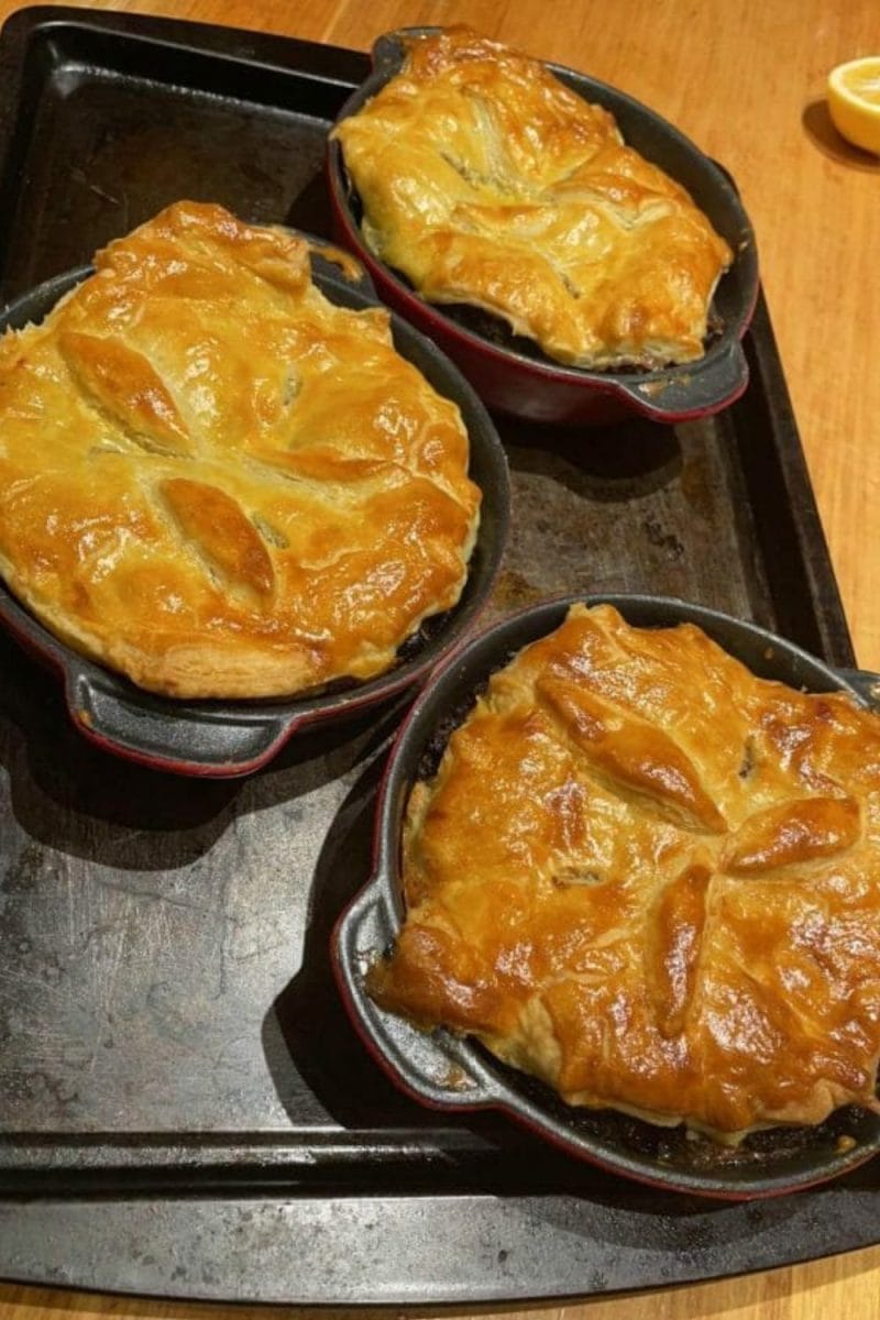 If you’re using frozen puff pastry, get it out of the freezer to defrost. If you’re using fresh puff pastry, roll it out and cut 6 rounds. Fill your pie dishes and cover with the pie lids