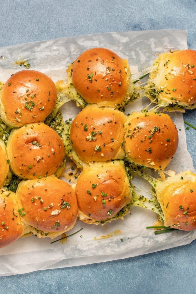What I love most about this recipe is how little effort it takes. No cooking the chicken from scratch — just toss it with pesto, pile it onto the rolls with mozzarella, brush the tops with herb butter, and let the oven do the rest. That butter on top is a small step that makes a big difference, giving the buns a golden, glossy finish that makes them look far more impressive than the effort involved.