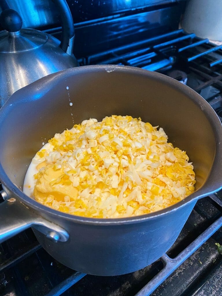 - Remove from heat. Stir in cheddar, gruyère, and mozzarella in two batches until fully melted and smooth.