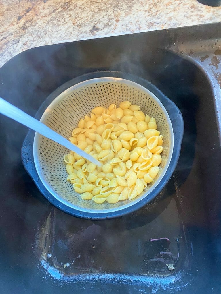 - Cook the macaroni in well-salted boiling water for 2 minutes less than package directions. Drain and set aside — do not rinse.