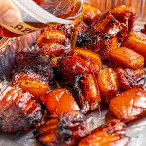 - Braise in glaze: Transfer smoked pork belly cubes to disposable aluminum pan. Pour glaze over meat and toss to coat completely. Cover pan tightly with foil.