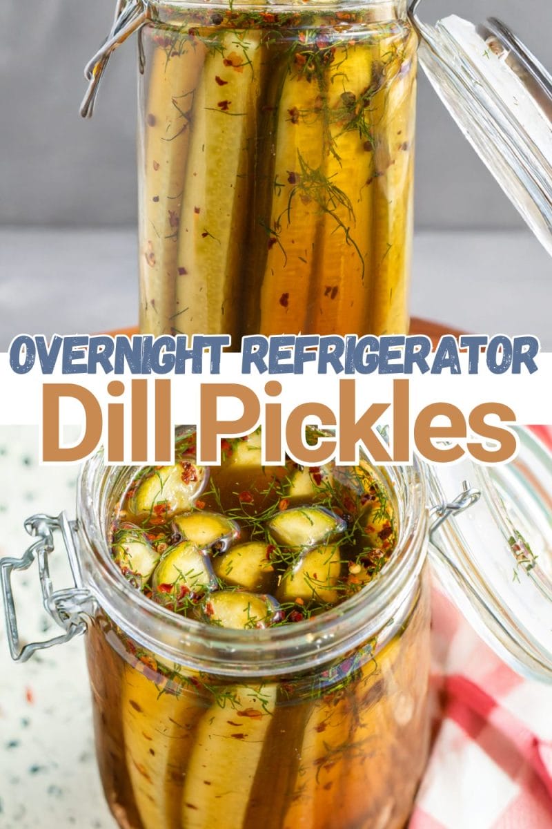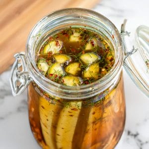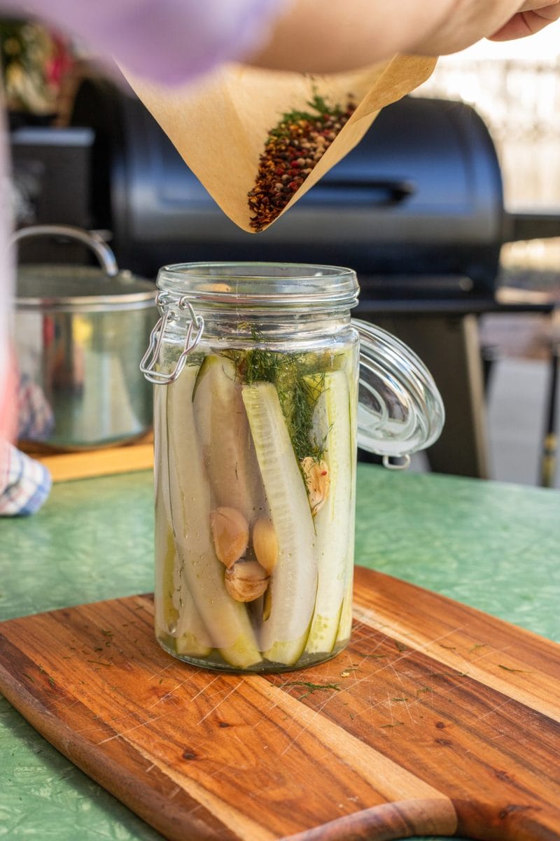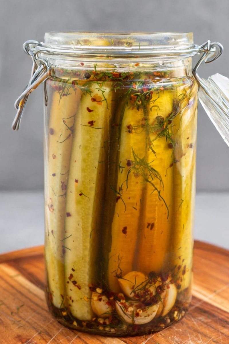 English cucumbers: If pickling cucumbers aren’t available, English cucumbers cut into spears work well. Their skin is more delicate so they soften a little faster — plan to eat these within 5 days for best texture.