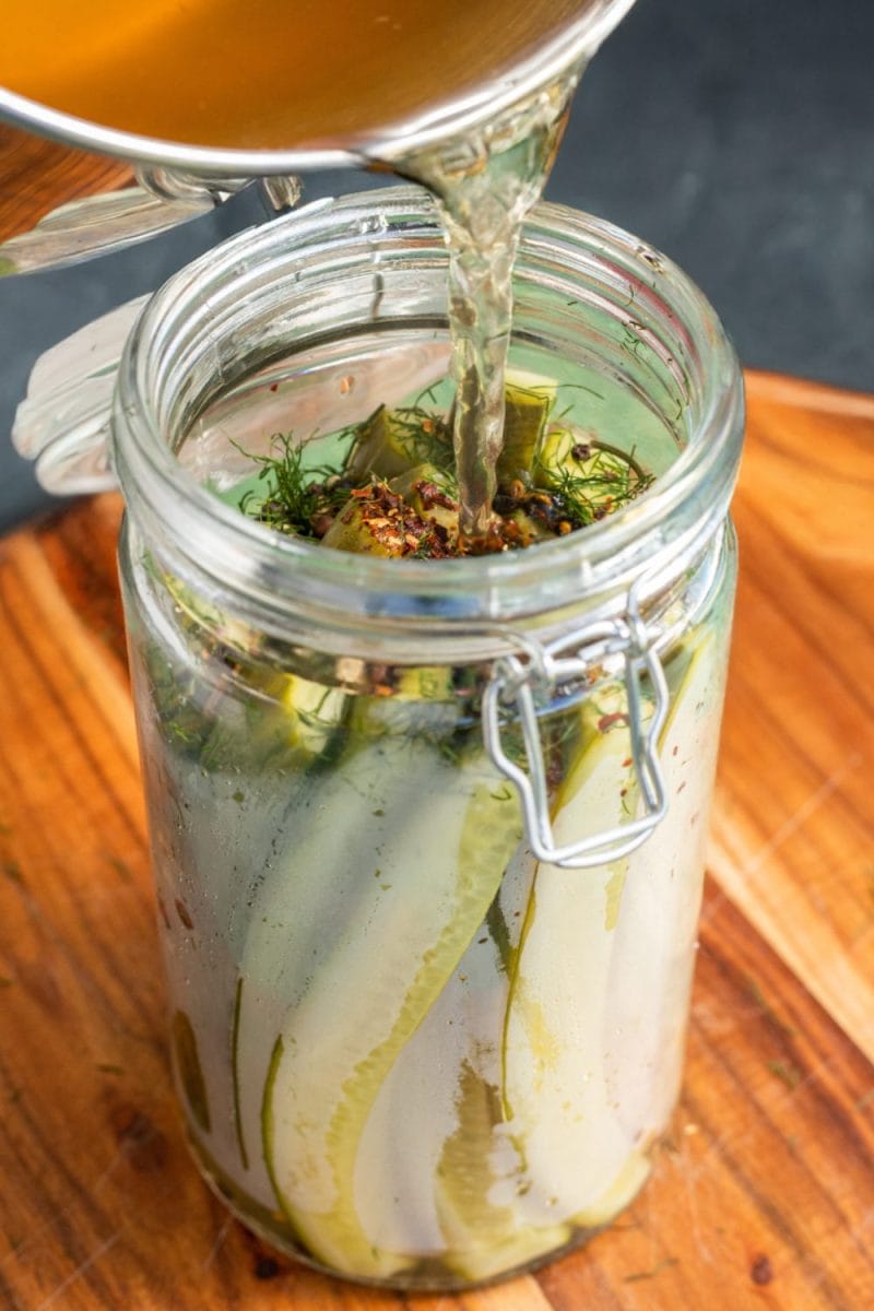 Warm brine dissolves the seasonings fully and begins relaxing the cucumber cells slightly, which helps the pickling process get started faster. If you prefer maximum crunch above all else, cold brine works too — just budget an extra 12 to 24 hours before the spears are fully flavored.