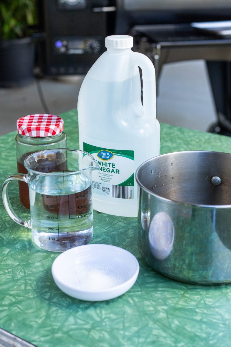 - Combine vinegar, water, kosher salt, and sugar in a small saucepan over medium heat. Stir until fully dissolved, about 2–3 minutes. Remove from heat.