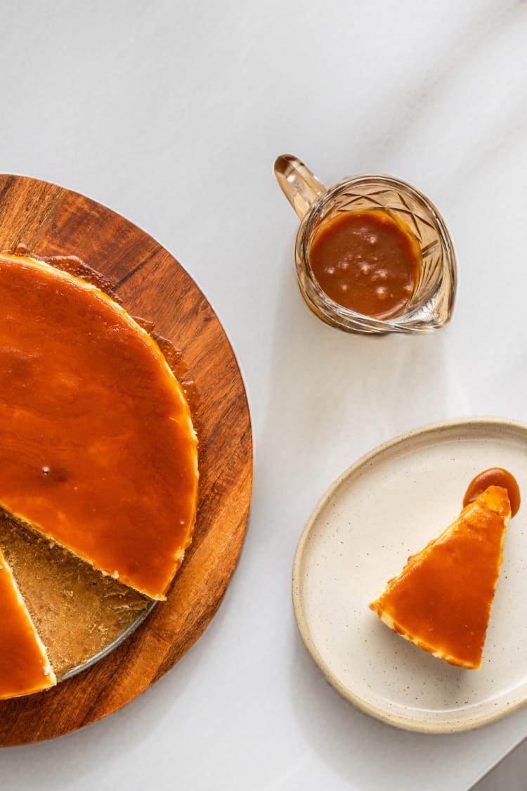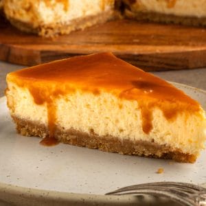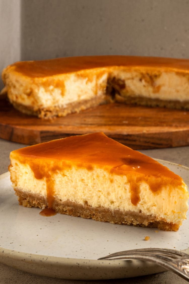 This cheesecake is served chilled, so no reheating is needed. Remove from the refrigerator 10 minutes before serving to allow it to soften slightly. Store caramel sauce separately in the fridge for up to one week.