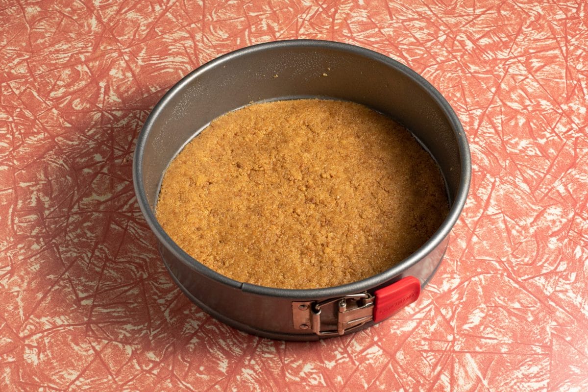 - Preheat oven to 325°F. Crush graham crackers and mix with sugar and melted butter. Press into bottom of 9-inch springform pan.