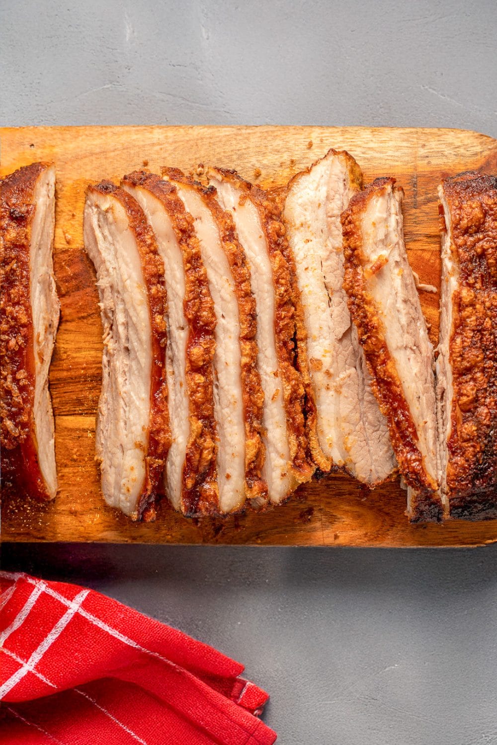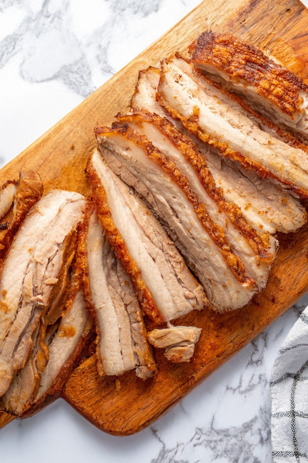 - Remove the pork belly from under the broiler once you are happy with the crackling. Check the internal temperature you want it to be 203°F
