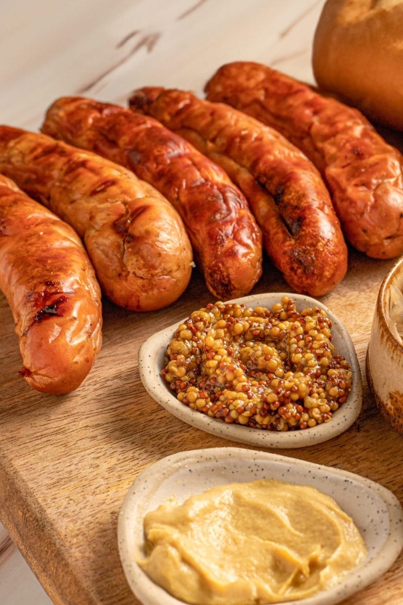 Juicy, smoky bratwursts — serve sliced as an appetizer or in mini buns.