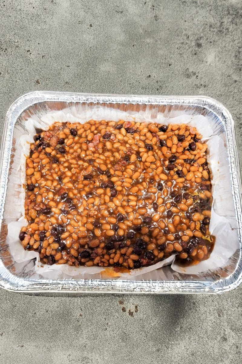 - Thick-cut bacon — Thin bacon disappears into the beans. You want chunky pieces that render down beautifully and finish crispy on top during the smoke. Cook them just until the fat renders before assembling the tray.