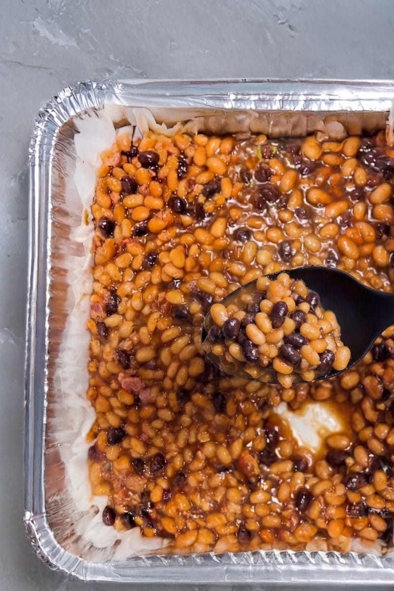 Tip the onion mixture into your disposable foil tray and add the drained beans. Pour in the BBQ sauce, brown sugar, molasses, apple cider vinegar, Dijon mustard, Worcestershire sauce, and all the spices. Give everything a thorough stir, taste for seasoning — adjust sweetness, heat, or tang to your liking — then lay the bacon pieces over the top in a single layer.