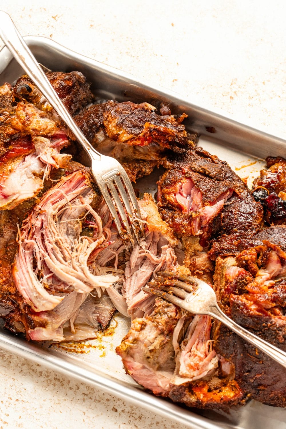 When the pork reaches an internal temperature of 195°F to 205°F, remove it from the crockpot. Let it rest for 10 minutes. Then, shred the meat using two forks, your hands, or bear claws, and discard the excess fat. If using your hands, wear protective gloves.