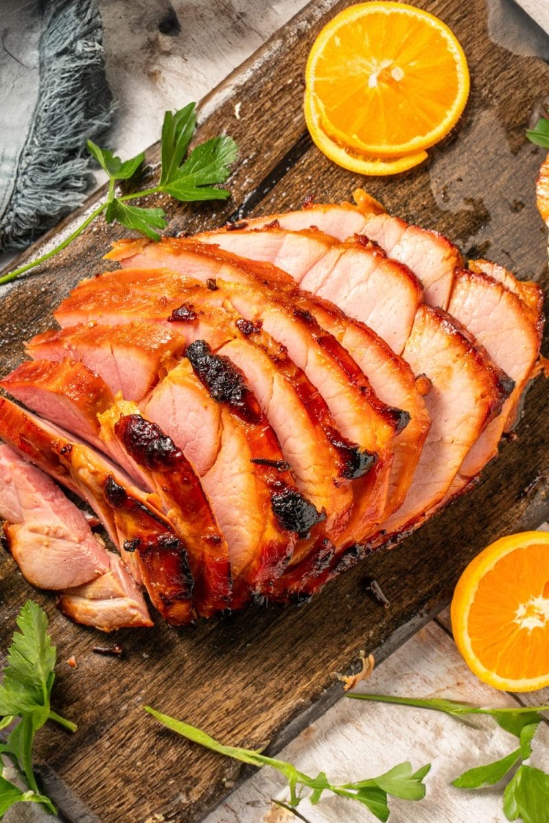 - Prepare the glaze by mixing together brown sugar, orange juice, and mustard until thick and glossy.