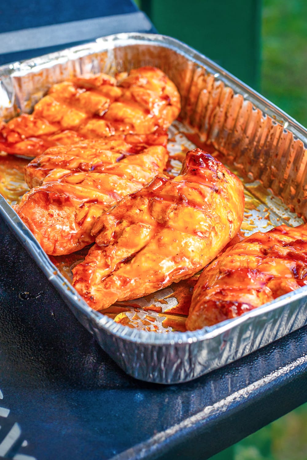 Return the tray to the smoker and allow the chicken to reach 165°F internal temperature (if it hasn’t already.) It’s fine if the chicken reads higher; the point is to make sure the chicken is cooked and the flavor of the sauce has gotten into the chicken. Once some of the liquid has evaporated and the temperature has reached 165°F, the chicken is ready to eat.