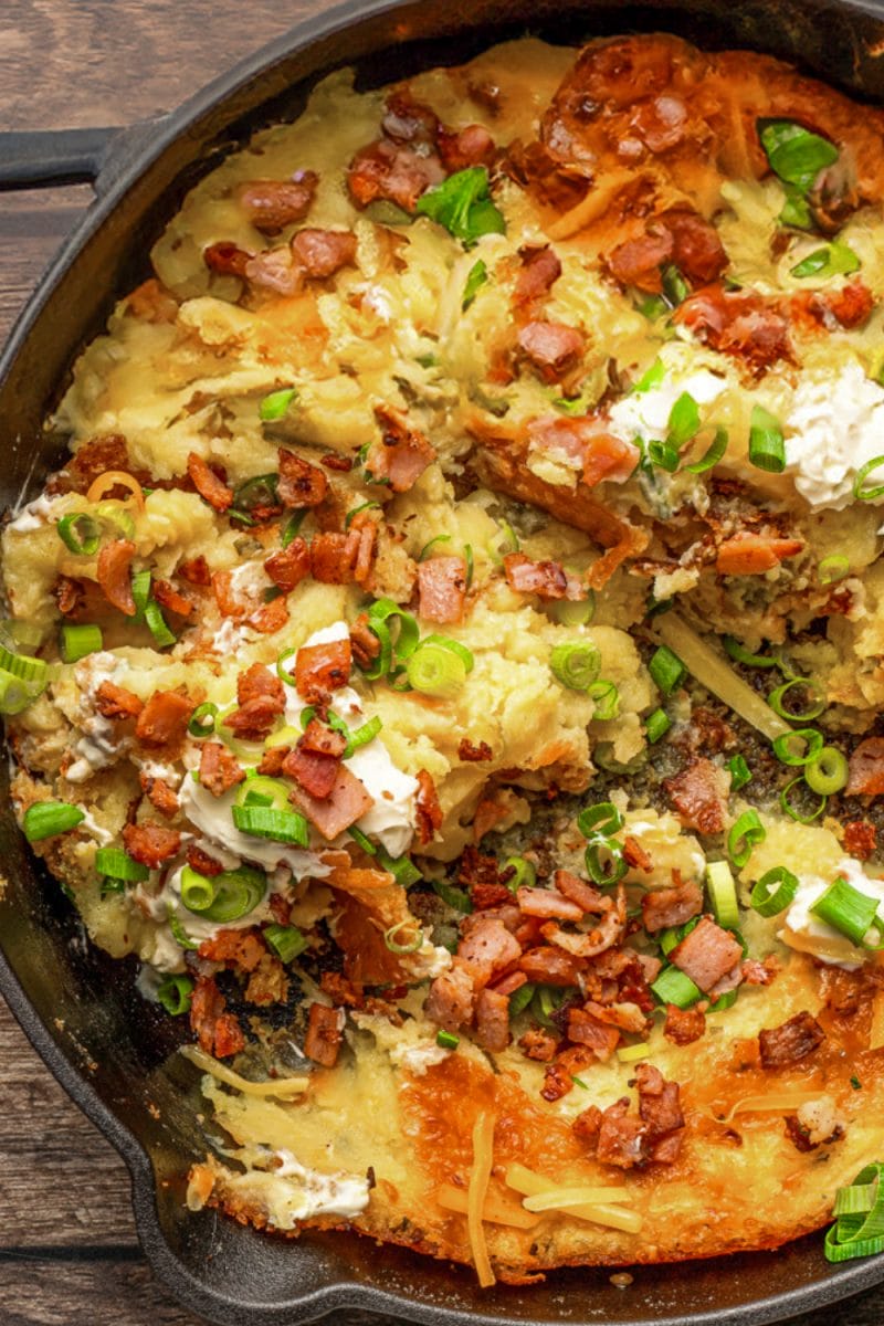 - Slice your green onions.Set aside.Dice up bacon.Fry up the bacon in your cast iron skillet (or whatever pan you are going to use for smoking the potatoes).Set aside bacon.We’ll use this same pan later to spread the mashed potatoes on.